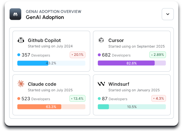 Gain full visibility into which GenAI tools actually drive results. Identify what empowers your teams, what slows them down, and where to focus for maximum impact – all through clear, data-backed insights.