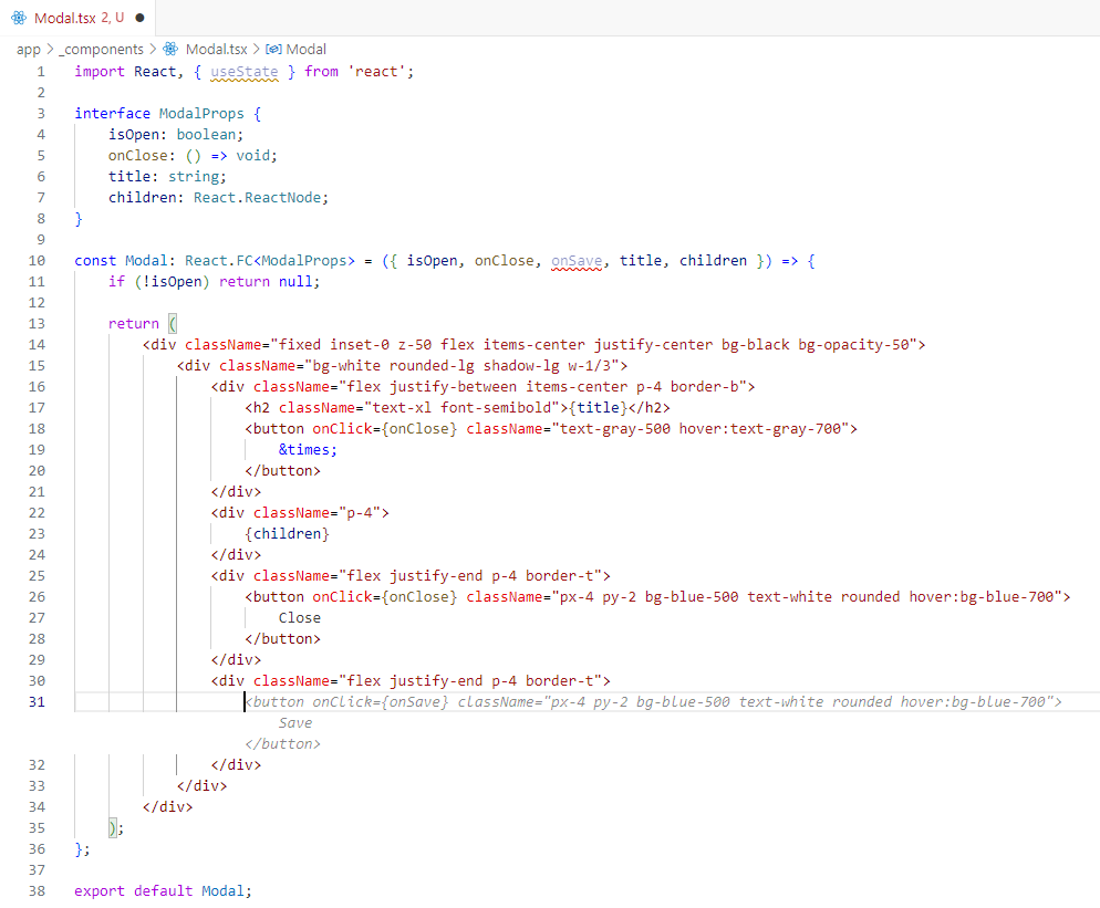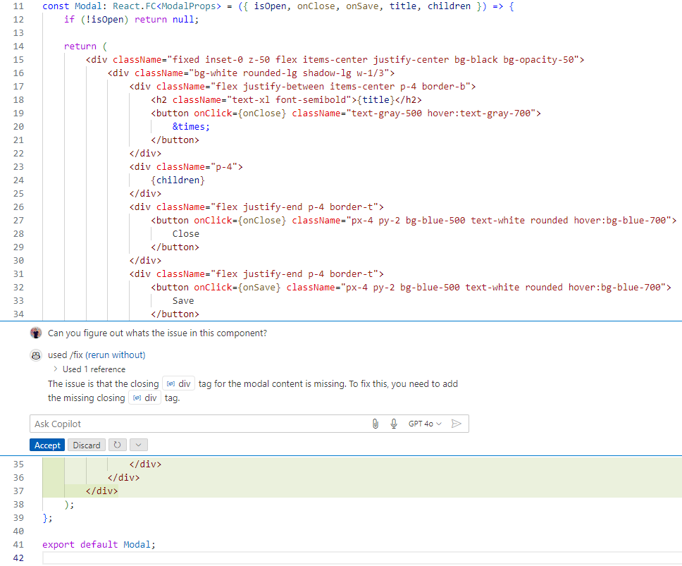 In addition to code generation, GenAI tools such as GitHub Copilot can also be used to provide code suggestions while developers are implementing new functionality. For example, by adding a new prop to handle the functionality of clicking on a save button in the Modal, Copilot will automatically suggest the code required to implement the button that’s responsible for handling the click event. This can be seen in the screenshot below. This further highlights the seamless capabilities of GenAI and the significant positive impact it has on developer productivity.