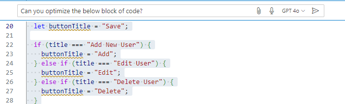 GenAI can also be utilized to optimize code, reduce cognitive complexity, and improve performance. The following example shows GitHub Copilot optimizing a block of code to just one line of code.