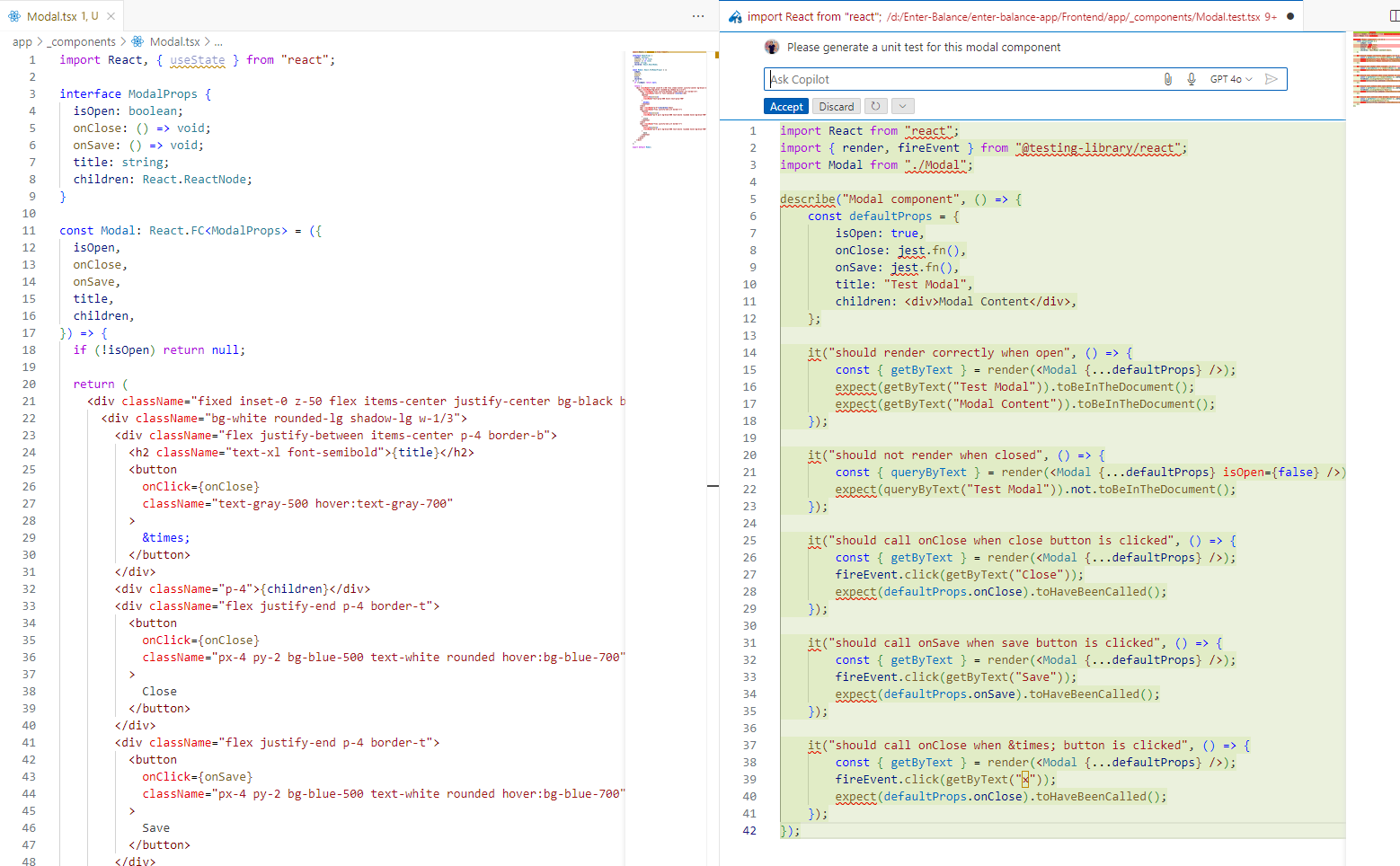 The screenshot below shows an example of how GenAI can be utilized for testing. GitHub Copilot generates a comprehensive set of unit test cases for the Modal component using simple natural language.