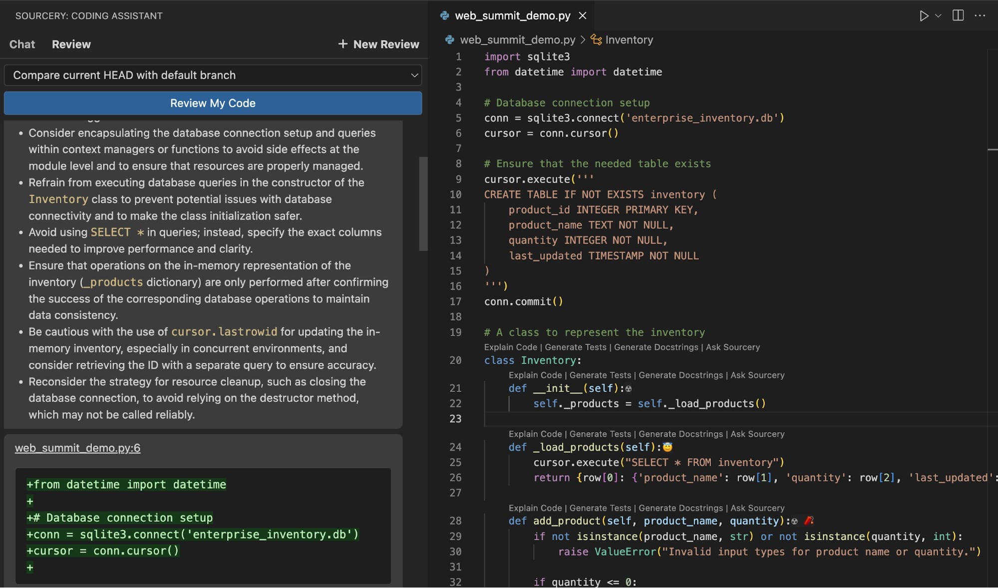 As an example, Sourcery can analyze a Python script and suggest improvements to streamline the code and align it with best practices: