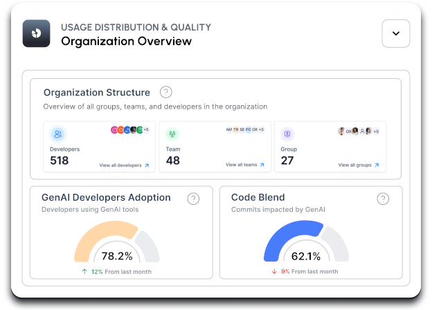 Stop guessing – start measuring. Track productivity, quality, and ROI from every GenAI-assisted workflow, so you can prove value to leadership and double down on what truly delivers.