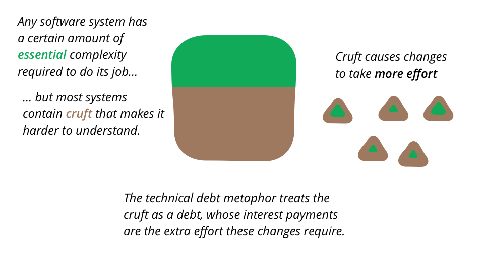 - Legacy code and technology: Building on outdated code and technology generally increases complexity and maintenance costs.