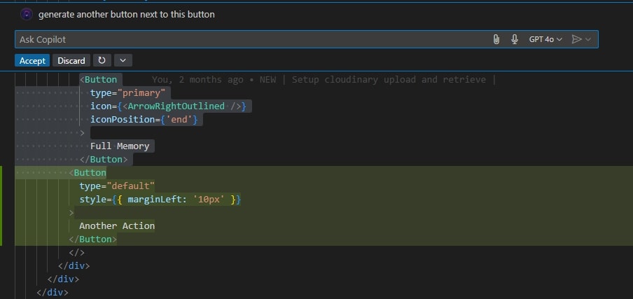 For instance, with just a prompt, Copilot can generate an additional button in a React project alongside an existing one, as shown below.